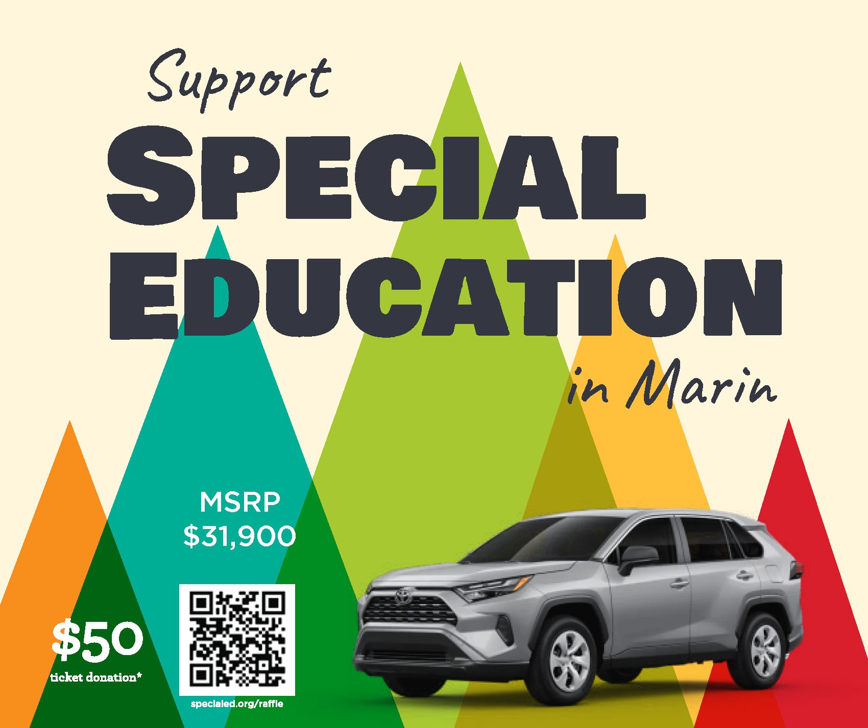 Mail-In donations also accepted. Please make check payable to ‘Dedication to Special Education’ PO BOX 4925 San Rafael, CA. 94913. Proceeds directly benefit special education students throughout Marin County, providing students and educators with the tools they need to succeed. Thank you for your support. Donations must be received prior to drawing time on February 7th, 2026. Limit 10 tickets per person. Must be 18 years of age or older. Winner responsible for all taxes, title and registration fees. Suggested donation $50. No purchase, contribution, or payment of any kind is necessary. Actual prize may vary from the one pictured. Approximate MSRP $31,900. No transfer or substitution of the prize may be made and no cash will be given in lieu of the prize. *If you choose not to make a donation, you must mail your request to the aforementioned address. Need not be present to win. Visit www.specialed.org/raffle or call 415.491.6636 for additional information.